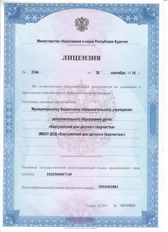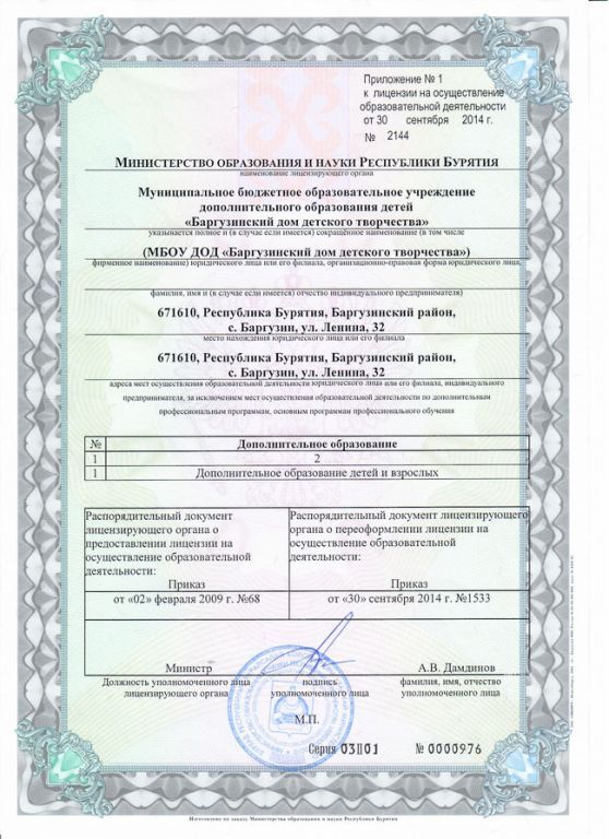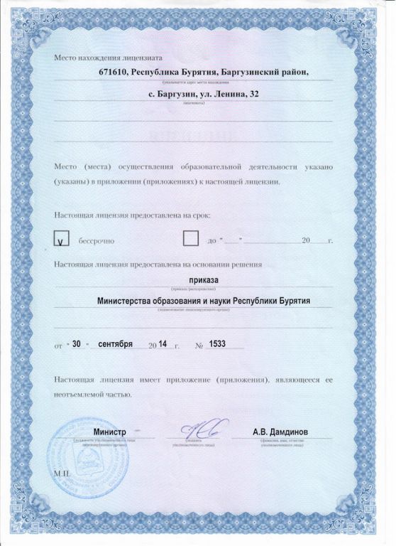 - Места осуществления образовательной деятельности по дополнительным образовательным программам: Республика Бурятия, с. Баргузин, ул. Ленина, д.32